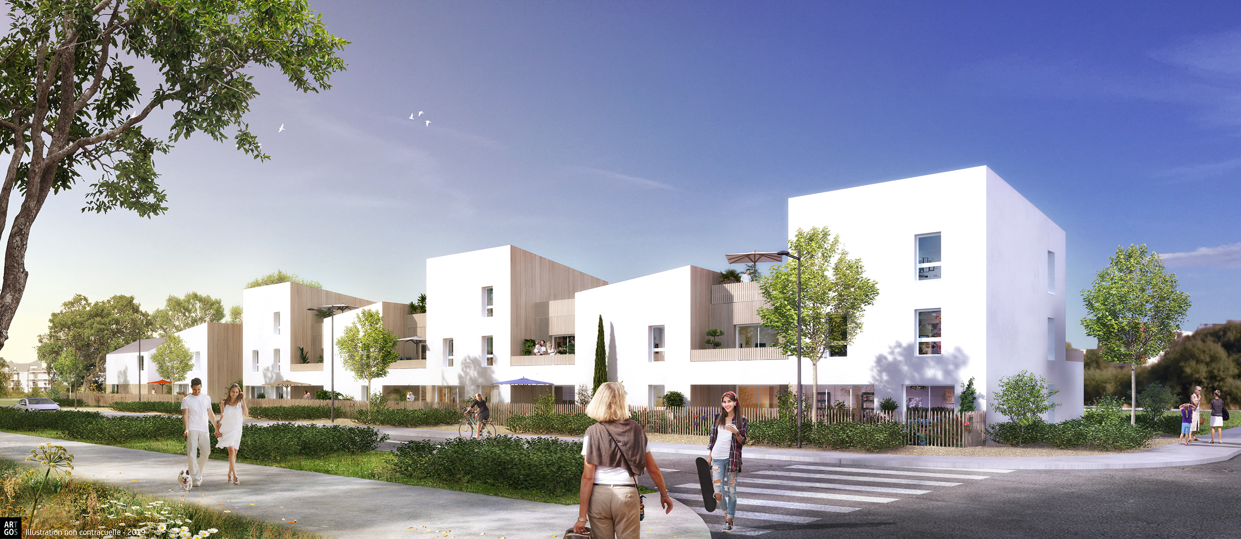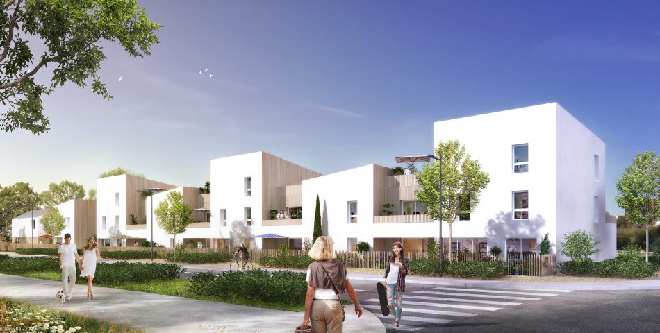 L’architecture intègre façades de bois, verre et acier. Ces matériaux nobles sont mis en valeur par les espaces paysagers et les jeux d’eau. Les vastes terrasses donnent plein sud. Certaines sont végétalisées pour faire écho à l’environnement boisé. L’esprit village est souligné par le cœur d’îlot et ses aménagements paysagers ponctués de trois conteneurs qui accueillent une farm box et un local à vélos.