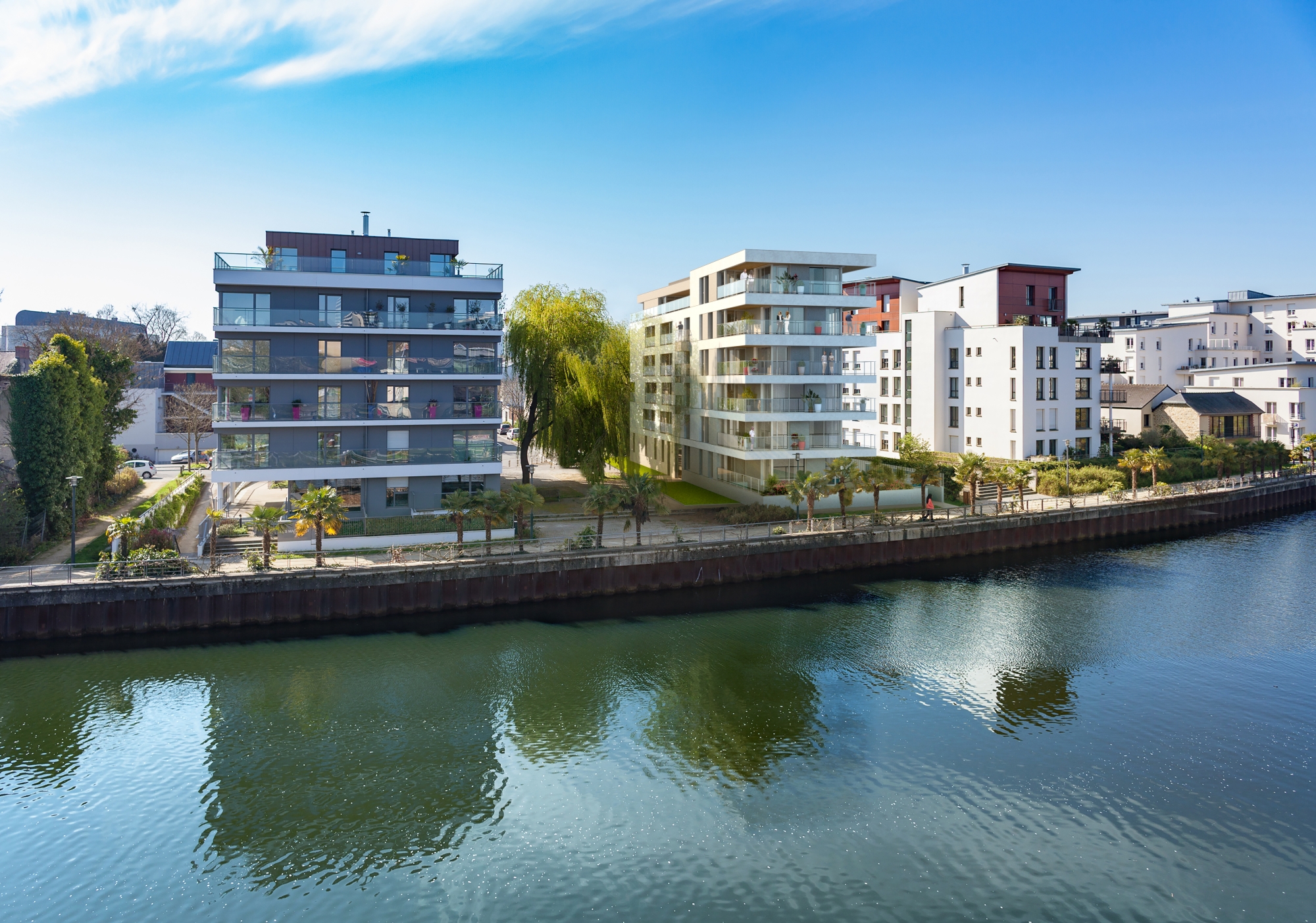 Cette résidence à l’architecture élégante et contemporaine se situe le long d’un chemin de halage en bordure de la Vilaine. Ce programme propose 17 appartements seulement du T2 au T5, les grands logements bénéficient de très belles terrasses avec une vue exceptionnelle sur la Vilaine. La proximité du centre-ville, des commerces et de la future station de métro ‘’ La Mabilais ‘’ offre un excellent confort de vie au quotidien.